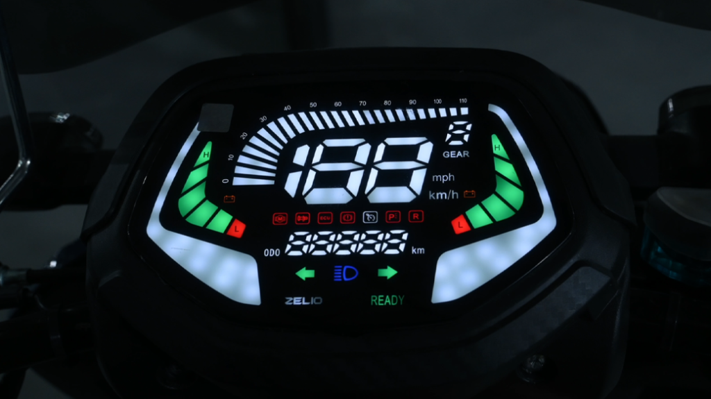 Digital Speedo Meter On Zelio E Bikes Features A Bright Light, Easy To Read Display Showing real-time speed, battery level, and trip distance.